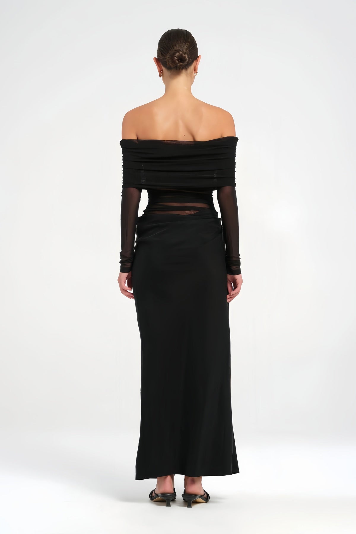 Šaty Estelle představují éterický a sofistikovaný outfit pro nezapomenutelné večery. Výstřih s odhalenými rameny a široké poloprůhledné rukávy vytvářejí romantický a jemný vzhled, zatímco tylové panely a měkké záhyby zvýrazňují siluetu s elegancí.