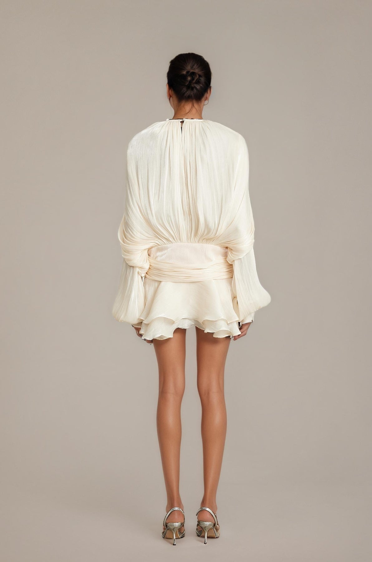 El corpiño drapeado y la falda plisada con un sutil brillo crean movimiento y feminidad, mientras los dobles volantes completan el look con un toque romántico — perfecto para las noches especiales.