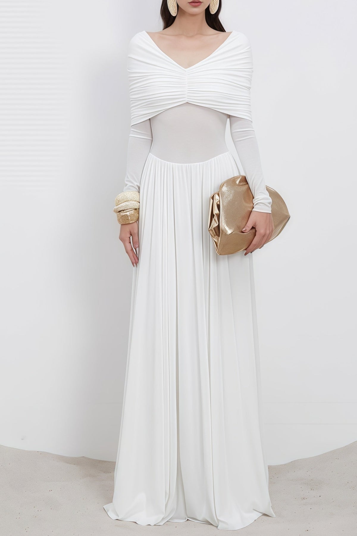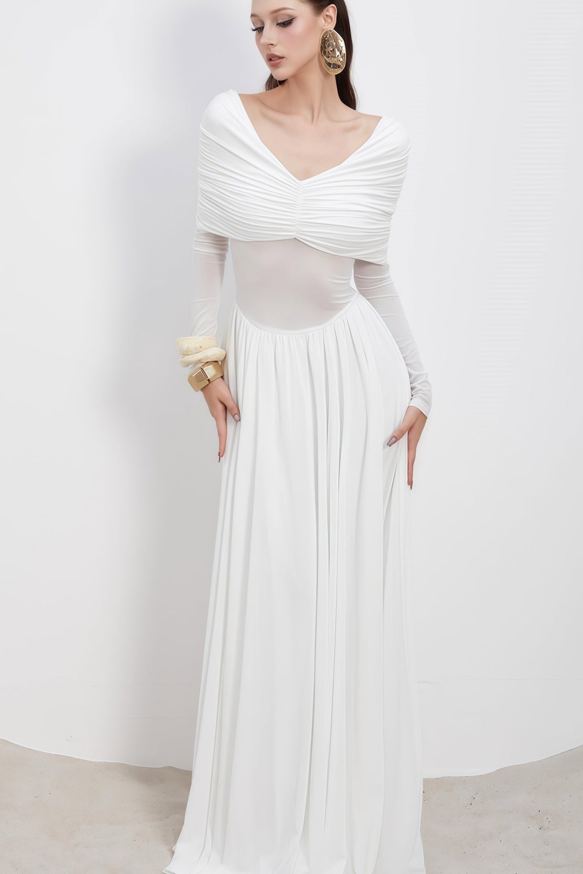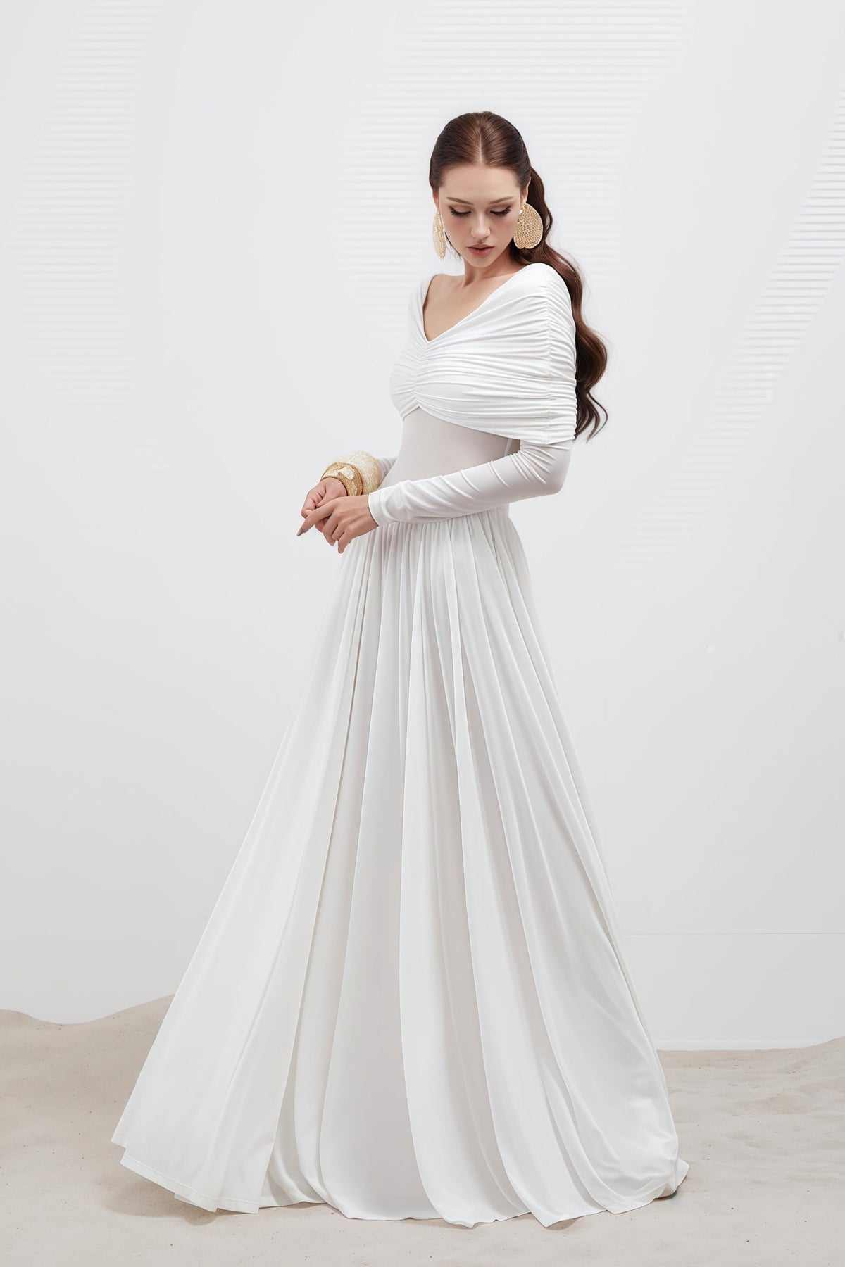 El vestido Celestine combina elegancia y ligereza en un tono blanco puro. Las mangas largas y el escote en V realzan la silueta, mientras el fruncido en el cuerpo aporta un encanto clásico y delicado.
